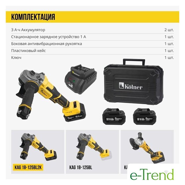 | Комплект поставки | - Руководство по эксплуатации 1 шт., - Ключ 1 шт., - Кейс 1 шт., - Аккумулятор KB 18-3St 2 шт., - Зарядное устройство KBC 18-1A 1шт. |