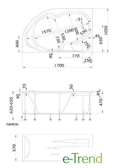 170x105 см, объём: 300 л
