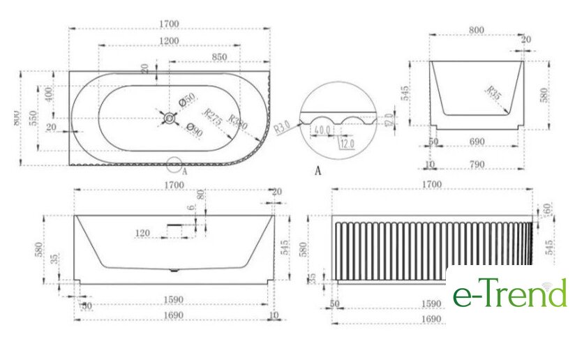 150x75 см, объём: 210 л