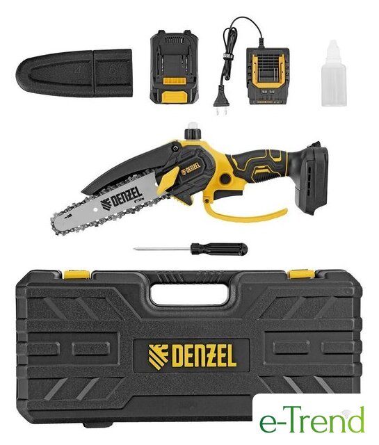 | Комплект поставки | - Мини-пила цепная аккумуляторная;- Масленка;- Аккумуляторная батарея Denzel Power System;- Зарядное устройство;- Кейс;- Инструкция по эксплуатации с гарантийным талоном. |