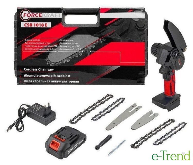 | Комплект поставки | - Пила цепная, - Аккумулятор, - Зарядное устройство для аккумулятора, - Полотно для цепи, длина 185мм, - Полотно для цепи, длина 130мм, - Цепь для пилы (длина 6") 2 шт., - Цепь для пилы (длина 4") 2 шт., - Отвертка переставная двусторнняя (SL5 - PH1) |