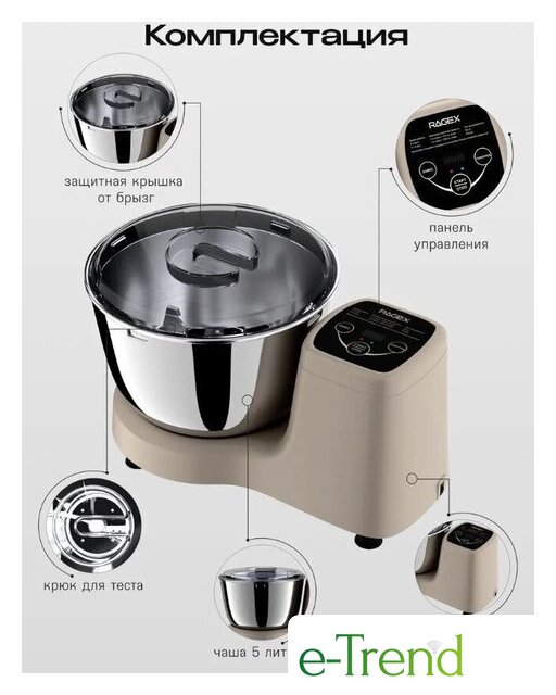 | Полная комплектация | тестомесильная машина, чаша из нержавеющей стали, насадка-крюк для теста, защитная крышка, руководство пользователя |