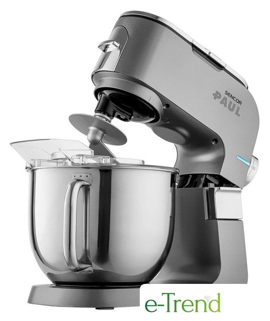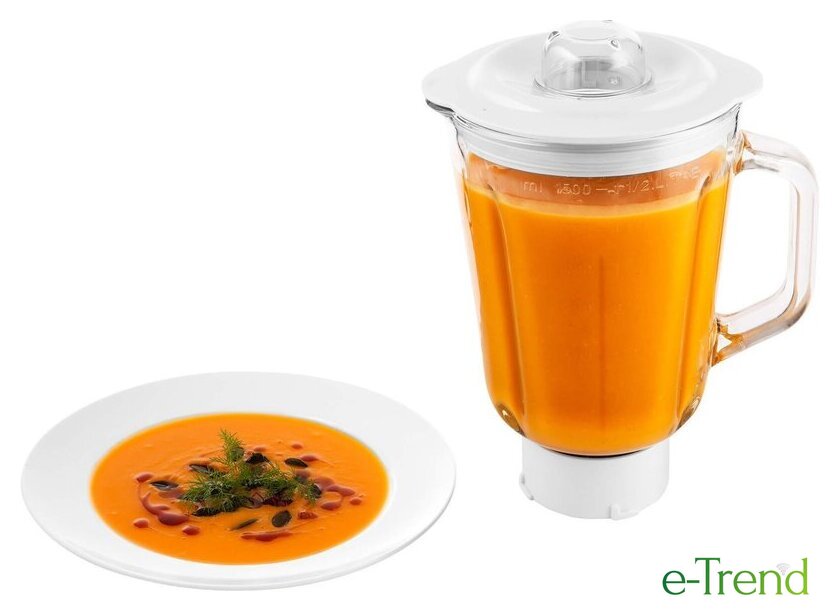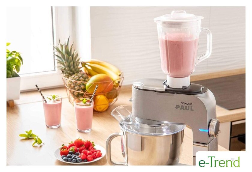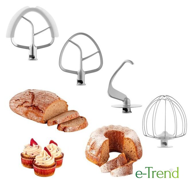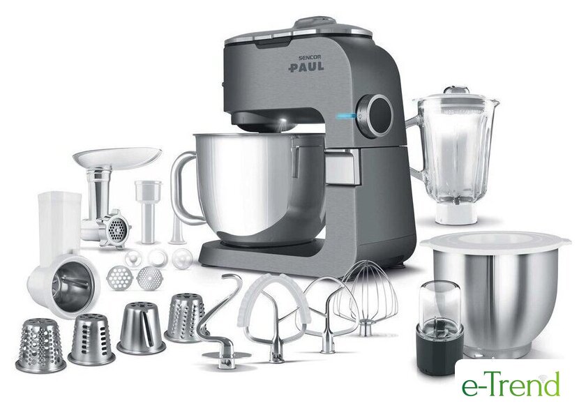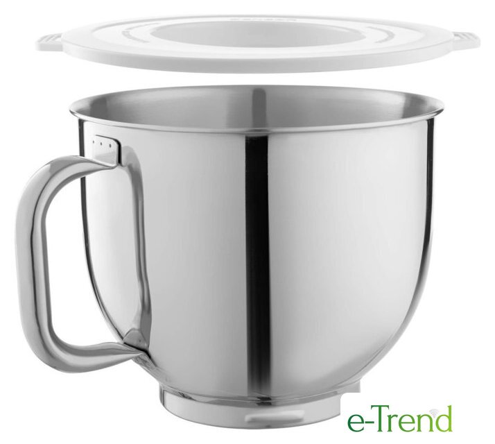 | Полная комплектация | чаша из нержавеющей стали 6.5 л, стеклянный блендер 1.5 л, мясорубка, мельница для кофе и специй, 3 насадки для замеса, взбивания и жидкого теста, гибкая насадка FLEXI, 4 тёрки из нержавеющей стали, формочка для печенья, насадка для приготовления колбас, защитная крышка на чашу, крышка для хранения |