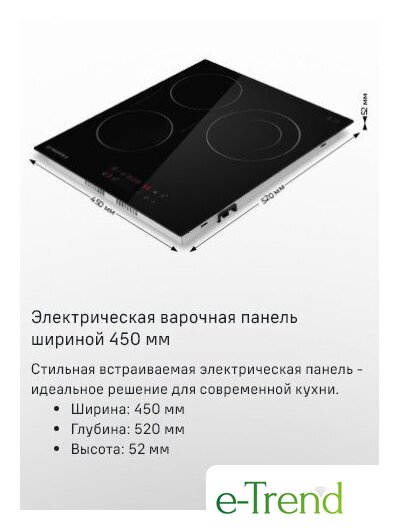 | Подробная информация о конфорках | 2х1200Вт1х900/1800 Вт |