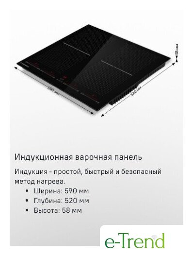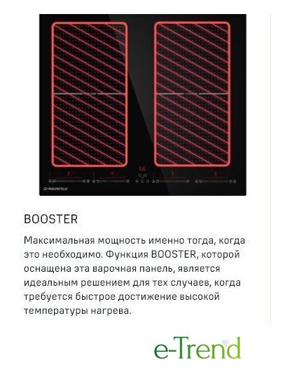 | Подробная информация о конфорках | 2х2000Вт (бустер 2800Вт)2х1500Вт (бустер 2000Вт) |