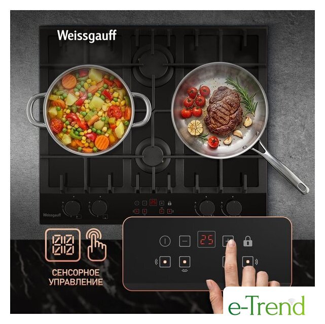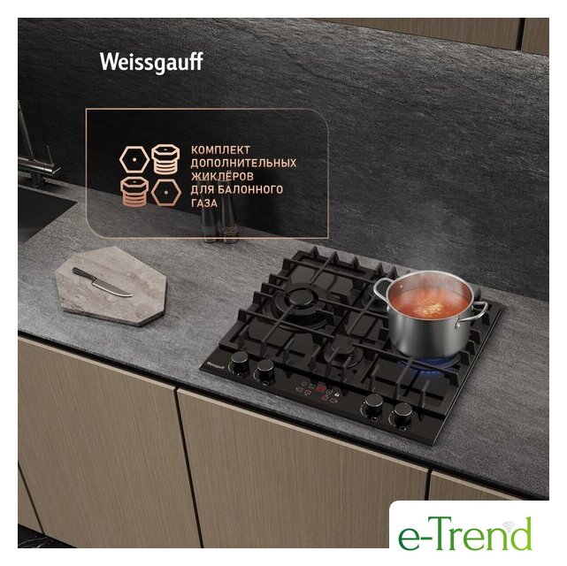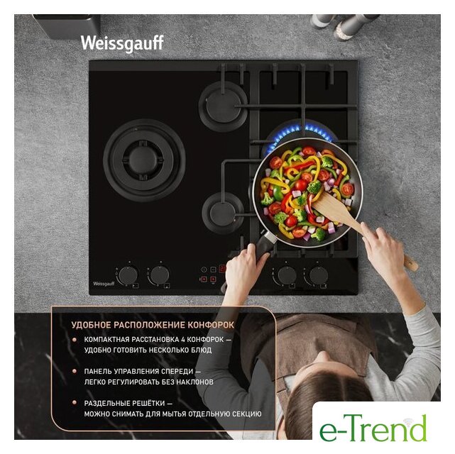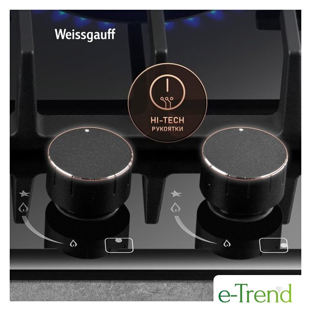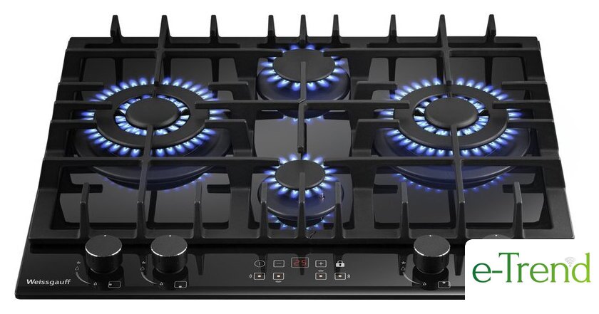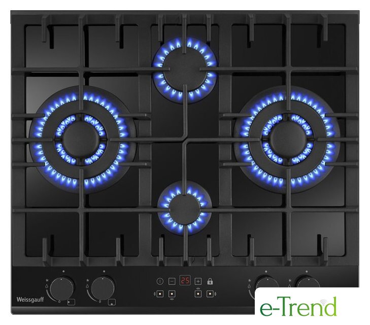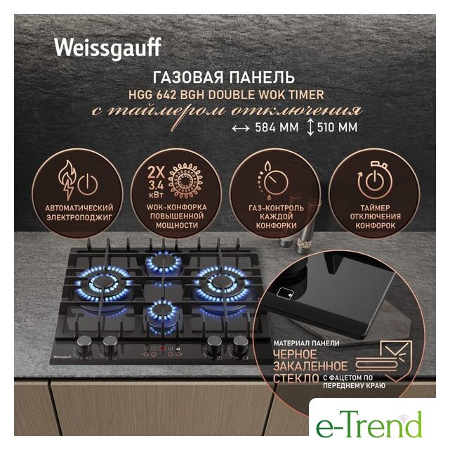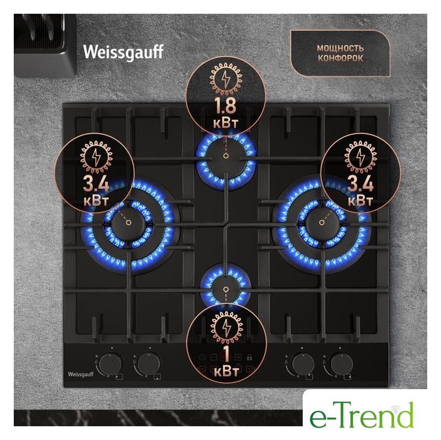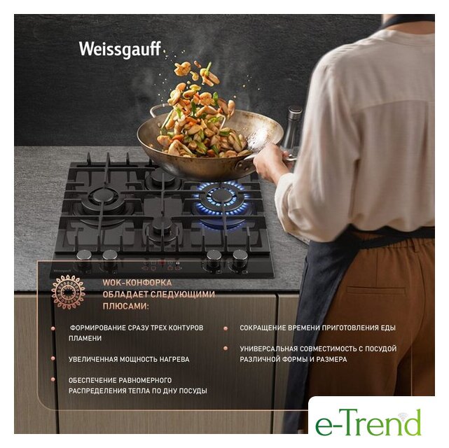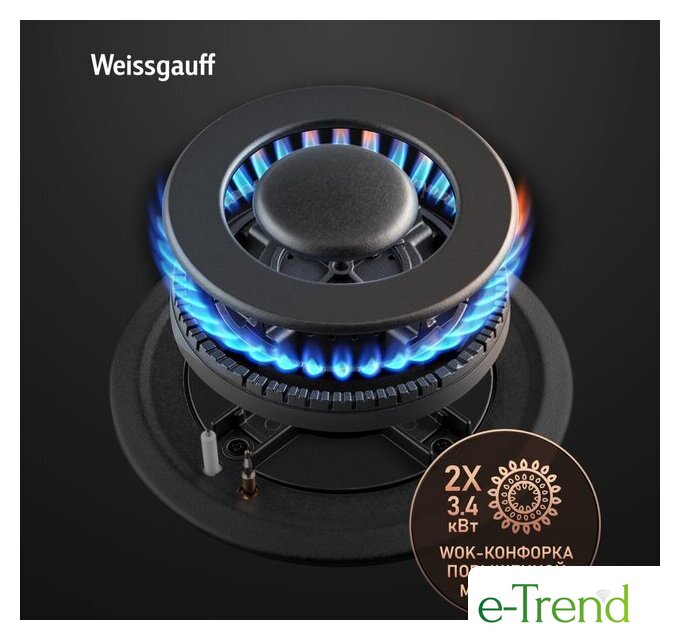 | Подробная информация о конфорках | Две WOK-конфорки мощностью по 3.4 кВт, одна средняя конфорка 1.8 кВт, одна малая конфорка 1.0 кВт |