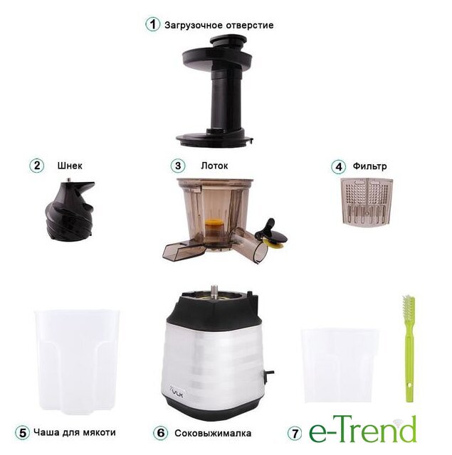 | Комплектация | СоковыжималкаТолкательЛотокШнекФильтрКрышка фильтраЧаша для мякотиЧаша для сокаЩетка |
