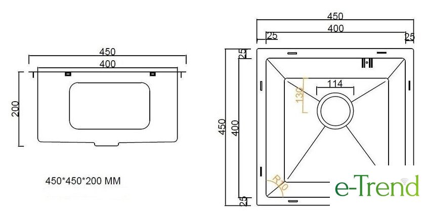 врезная под столешницу, нержавеющая сталь, размеры: 45x45 см