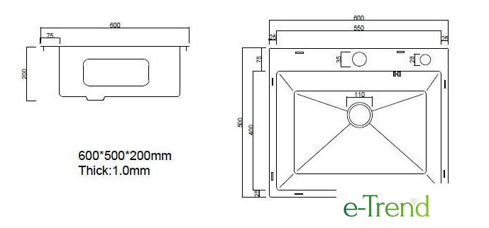 врезная на столешницу, нержавеющая сталь, размеры: 60x50 см