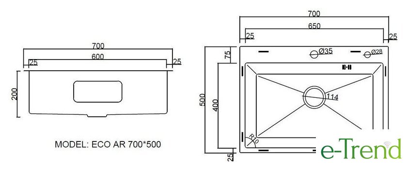 врезная на столешницу, нержавеющая сталь, размеры: 70x50 см