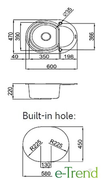 врезная на столешницу, искусственный камень, размеры: 60x47 см, в шкаф 45 см