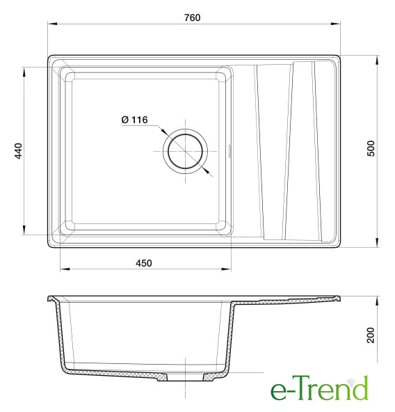 врезная на столешницу, искусственный камень, размеры: 76x50 см, в шкаф 60 см