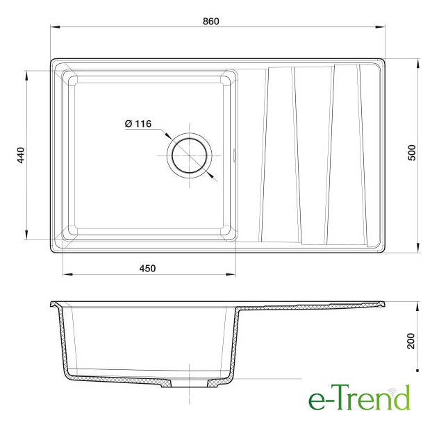врезная на столешницу, искусственный камень, размеры: 86x50 см, в шкаф 60 см