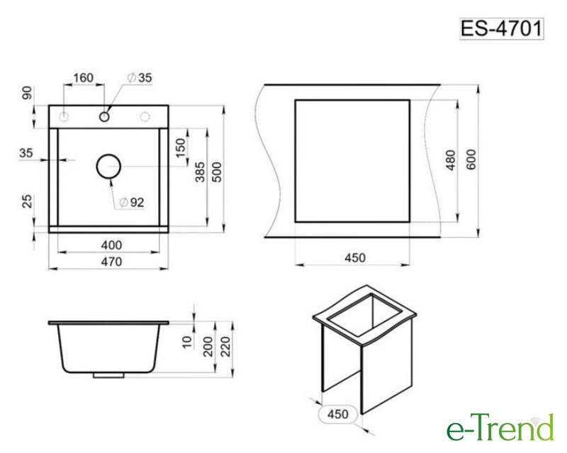 врезная на столешницу, искусственный камень, размеры: 50x47 см, в шкаф 45 см