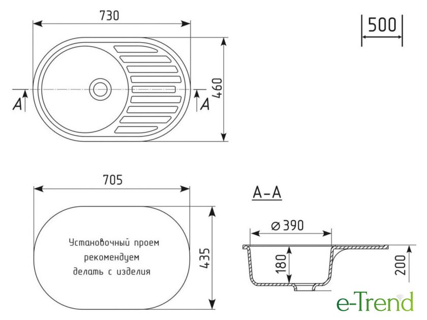 врезная на столешницу, искусственный камень, размеры: 73x46 см, в шкаф 50 см