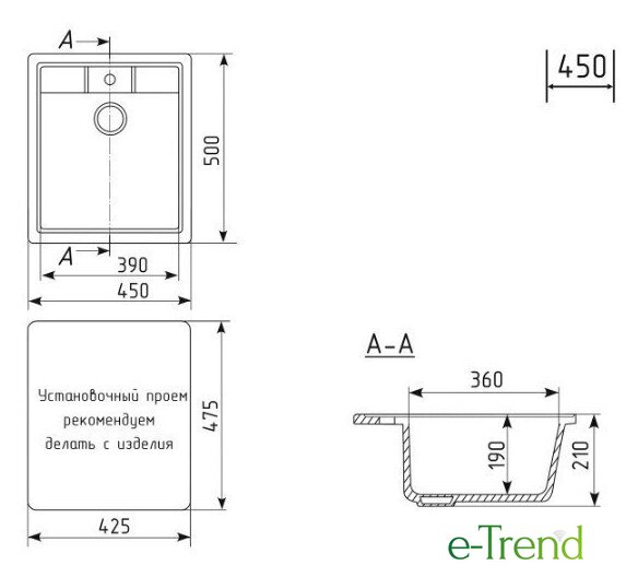 врезная на столешницу, искусственный камень, размеры: 45x50 см, в шкаф 45 см