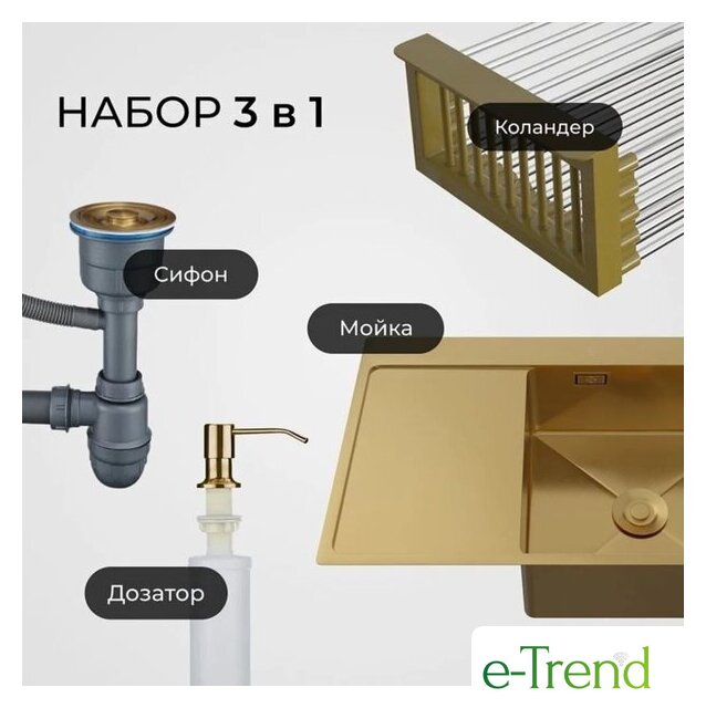 | Комплектация | мойка, дозатор врезной, сифон высокого качества с гофрой с универсальным выходом 40/50, комплект креплений |