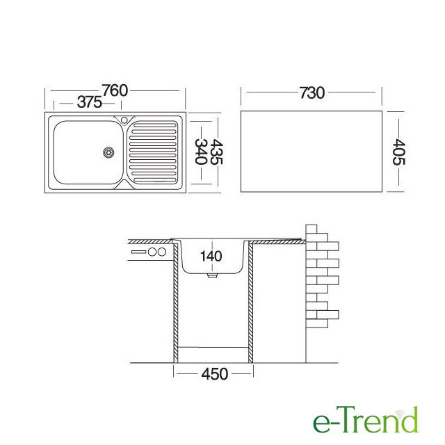 врезная на столешницу, нержавеющая сталь, размеры: 76x43.5 см, в шкаф 45 см