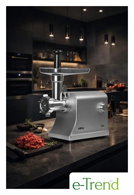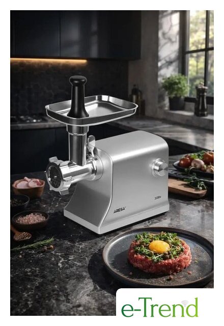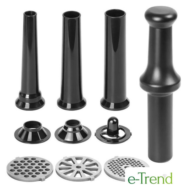 | Полная комплектация | фиксирующая гайка, решётка для помола (7 мм), решётка для помола (4 мм), решётка для рубленого мяса, самозатачивающийся режущий нож, шнек, загрузочная горловина, загрузочный лоток, толкатель, 3 насадки для приготовления колбасок/сосисок (14/20/22 мм), насадка для приготовления кеббе, инструкция |