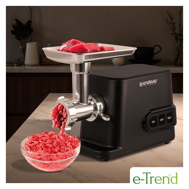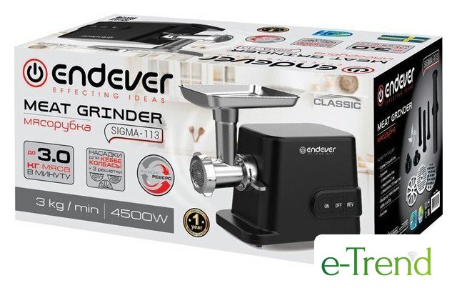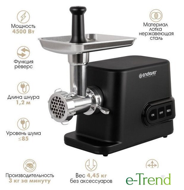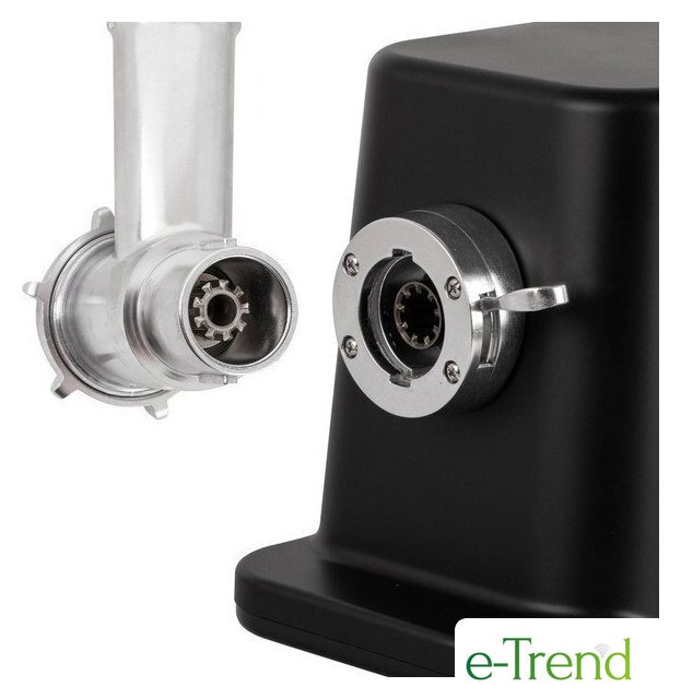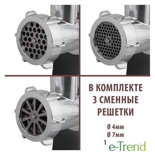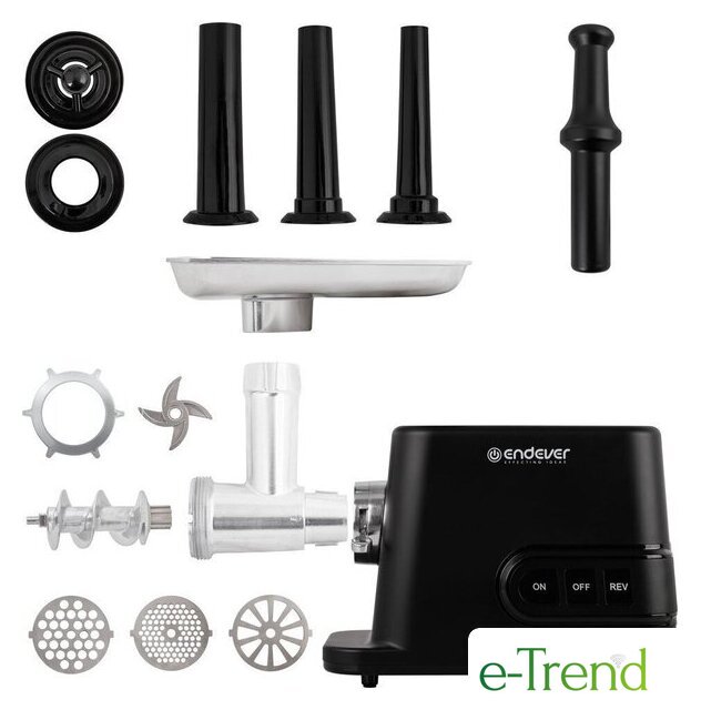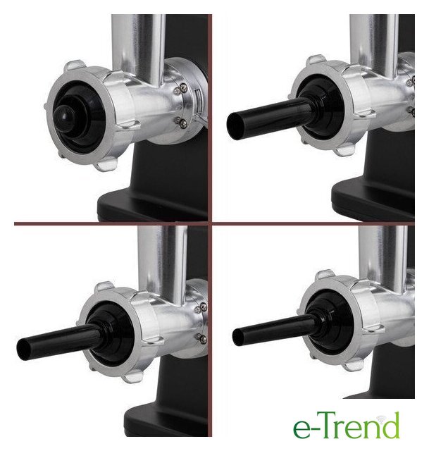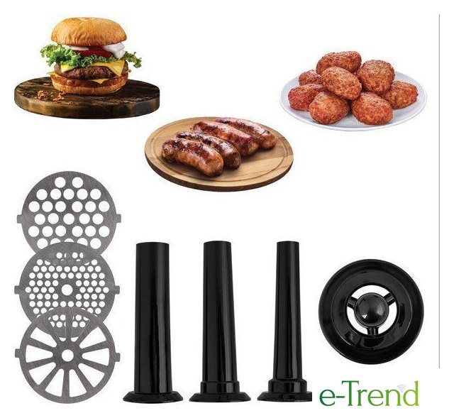 | Полная комплектация | мясорубка, металлический загрузочный лоток, нож, толкатель, фиксирующая гайка, шнек, 3 формовочных диска, насадки для кеббе и домашней колбасы, инструкция |