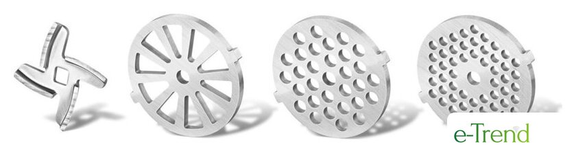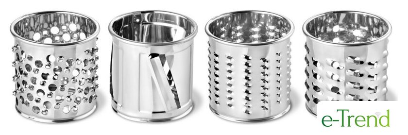 | Полная комплектация | овощерезка (4 насадки:терка крупная, терка мелкая, терка для драников, насадка для шинкования), крышка овощерезки, мясорубка (3 формовочных диска:диск для средней рубки, диск для крупной рубки, диск для рубленого мяса), 1 насадка для домашней колбасы, 1 насадка кеббе, толкатель |