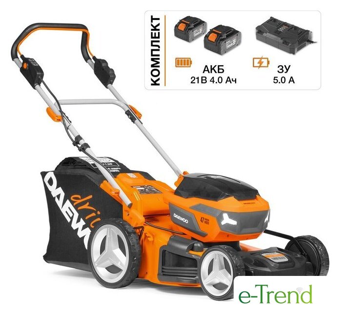 | Комплектация | - Газонокосилка - 1 шт., - Аккумулятор 4,0 Ач - 2 шт., - Зарядное устройство - 1 шт., - Нижняя часть рукоятки - 1 шт., - Верхняя рукоятка - 1 шт., - Травосборник - 1 шт., - Крепежные элементы - 1 комплект, - Руководство по эксплуатации, - Гарантийный талон, - Коробка |