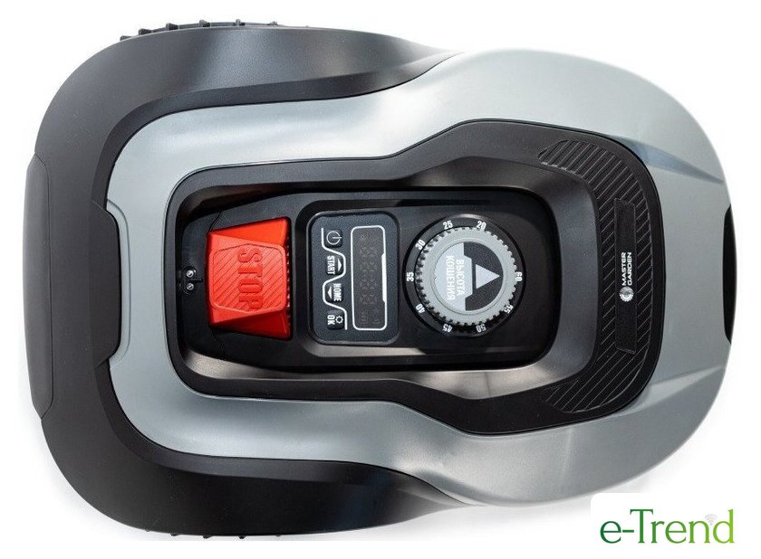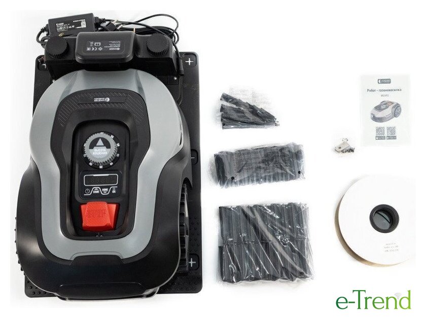 | Комплектация | • Ограничительный кабель - 200 м, • Колышки - 250 шт., • Гвозди для крепления базы - 6 шт., • Зарядная станция - 1 шт., • Зарядное устройство - 1 шт., • Ножи - 6 шт. + 3 шт. уже установлены, • Винты для лезвия - 6 шт., • Инструкция по эксплуатации - 1 шт. |