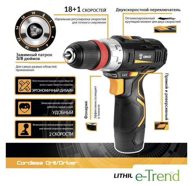 | Комплектация | - Дрель-шуруповерт - 1 шт.- Съемный патрон - 1 шт.- Аккумулятор - 1 шт.- Зарядное устройство - 1 шт.- Инструкция- Картонная коробка. |