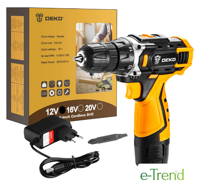 | Комплектация | - Дрель-шуруповерт;- Аккумулятор 1,5 Ач - 1 шт;- Зарядное устройство;- Инструкция;- Коробка. |