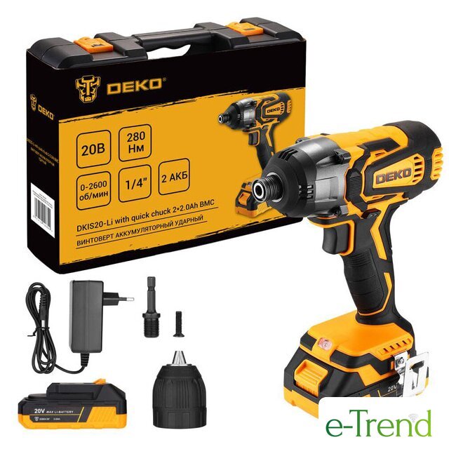 | Комплектация | - Винтоверт;- Аккумулятор 2,0 Ач - 2 шт;- Зарядное устройство;- Скоба поясная;- Дополнительный быстрозажимной патрон;- Переходник на быстрозажимной патрон;- Руководство по эксплуатации- Кейс. |