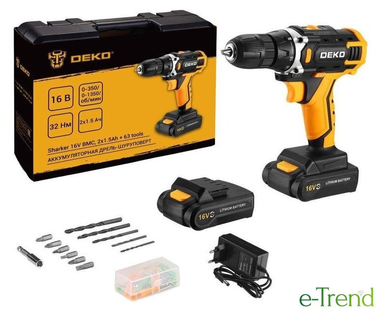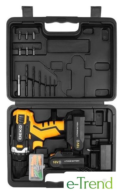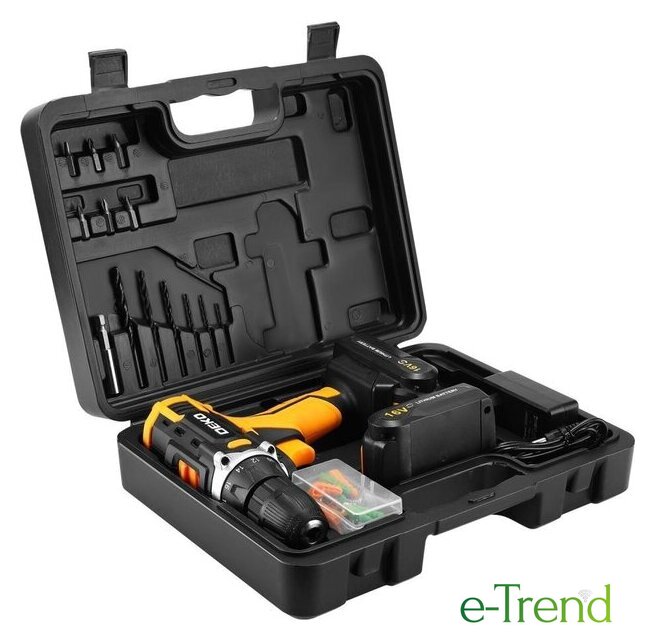 | Комплектация | - Дрель-шуруповерт - 1 шт.- Аккумулятор 1,5 Ач- 2 шт.- Зарядное устройство - 1 шт.- Биты - 6 шт.- Сверла - 6 шт.- Держатель бит - 1 шт.- Набор крепежа - 50 шт.- Инструкция.- Кейс. |