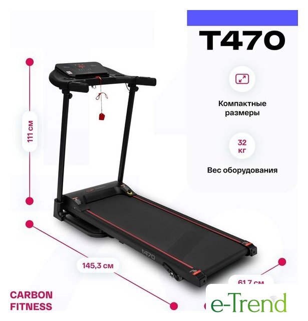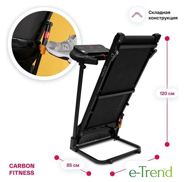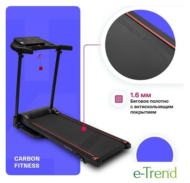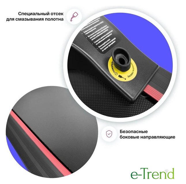 | Особенности | кнопки управления на поручнях, наличие ключа безопасности, система легкой ручной смазки бегового полотна и легкого складывания дорожки, отсеки для аксессуаров |