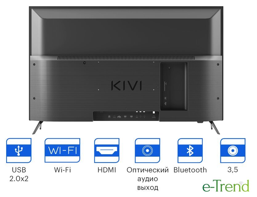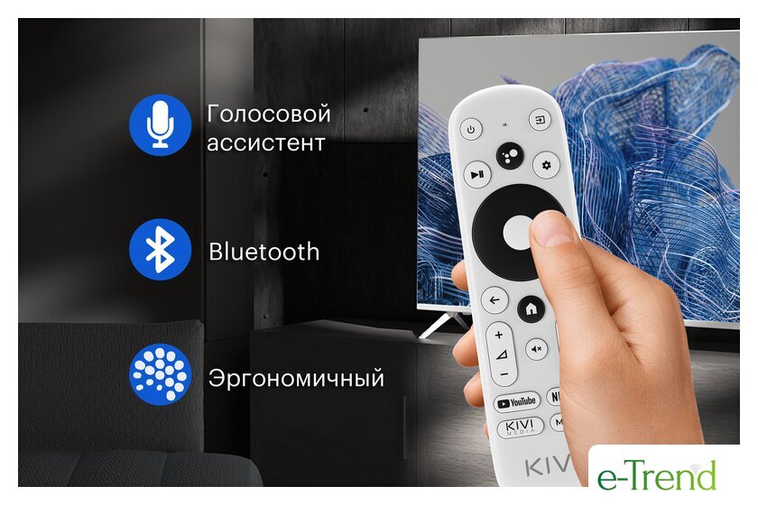 | Пульт в комплекте | KIVI RC40 – серый с голосовым управлением и кнопками Netflix, YouTube |