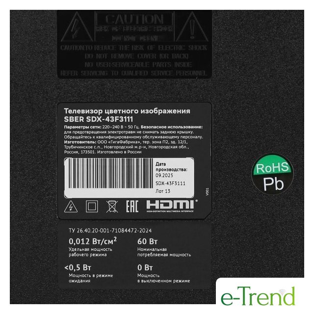 | Диагональ экрана | 43" |