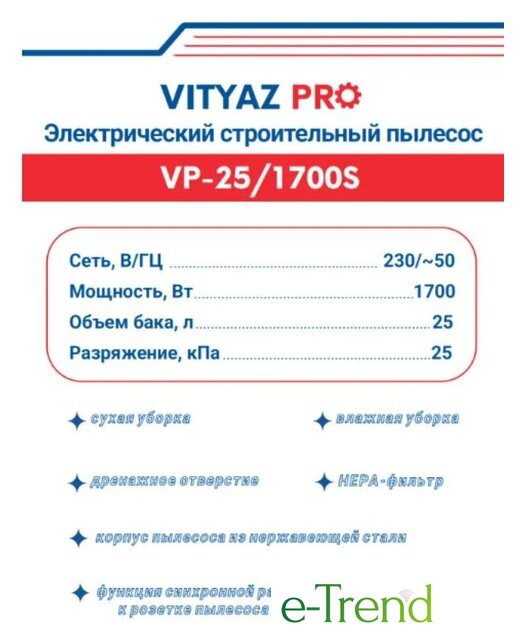 | Сила всасывания (разрежение) | 25 кПа |