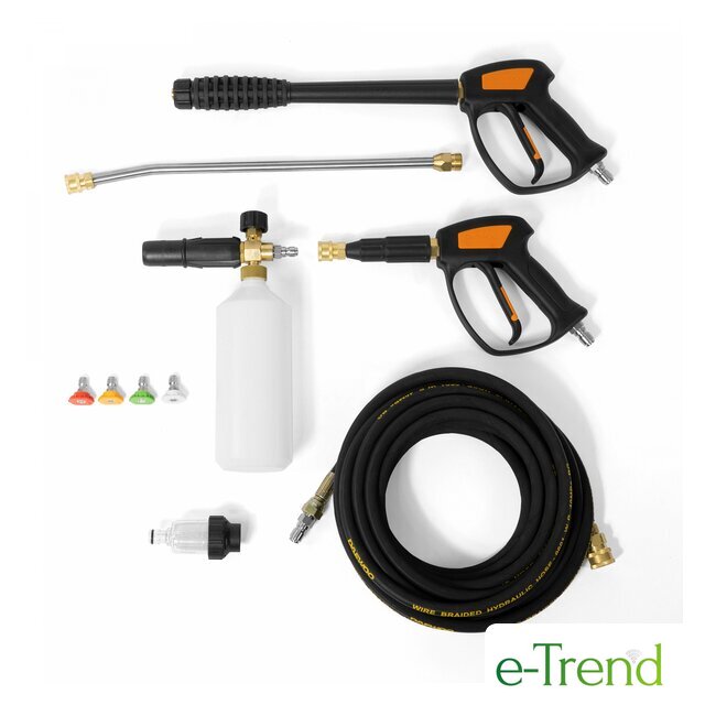 | Комплектация | Мойка высокого давления - 1 шт.Профессиональный пистолет DPG350 550 мм - 1 шт.Металлическое копье из нержавеющей стали 455 мм - 1 шт.Короткий пистолет для пеногенератора - 1 шт.Армированный шланг высокого давления 10м - 1 шт.Профессиональный пеногенератор - 1 шт.Быстросъемные форсунки (0°/15°/25°/40°) - 4 шт.Фильтр тонкой очистки - 1 шт.Кабель подключения 275 мм - 1 шт.ИнструкцияКоробка |