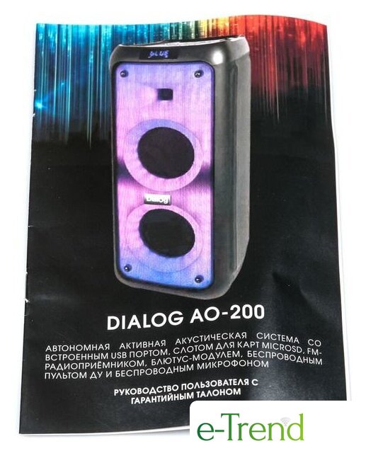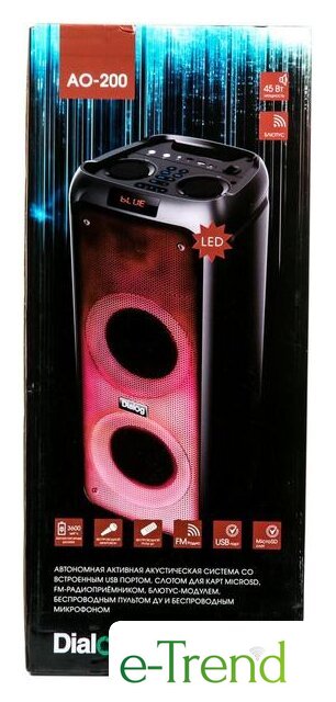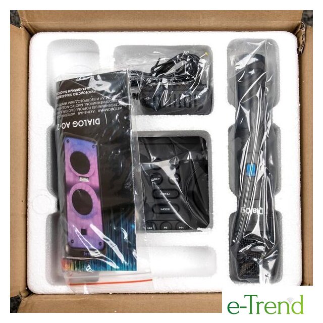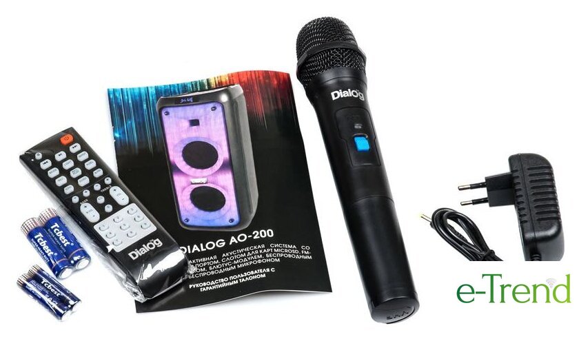 | Комплектация | акустическая система - 1шт;адаптер питания ~220В -> 9В 2А - 1 шт;беспроводной микрофон - 1 шт;ИК пульт ДУ - 1 шт;батарейки ААА для пульта ДУ - 2 шт;батарейки АА для беспроводного микрофона - 2 шт;руководство пользователя с гарантийным талоном - 1 шт;упаковка |